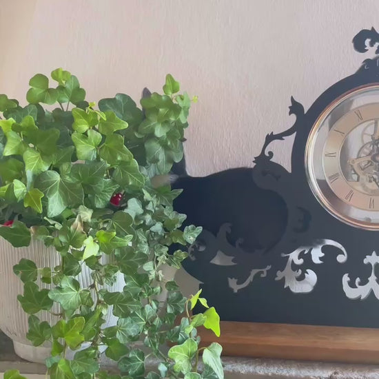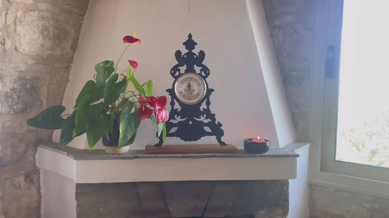 These mantel clocks combine timeless elegance with contemporary craftsmanship. Each piece features a skeleton clock mechanism, allowing the inner workings to remain visible, set within a precisely cut 6 mm (0.23″) acrylic silhouette and mounted on a solid natural wood base for warmth and stability.