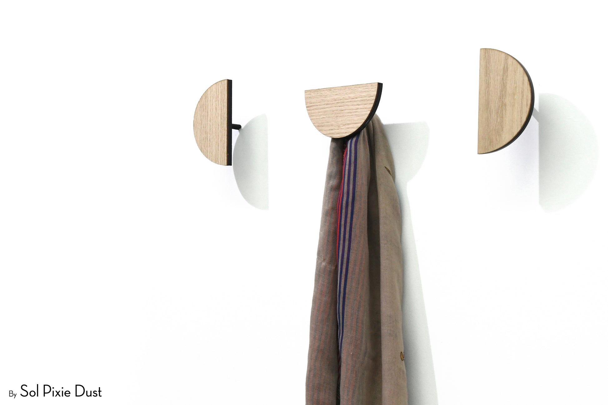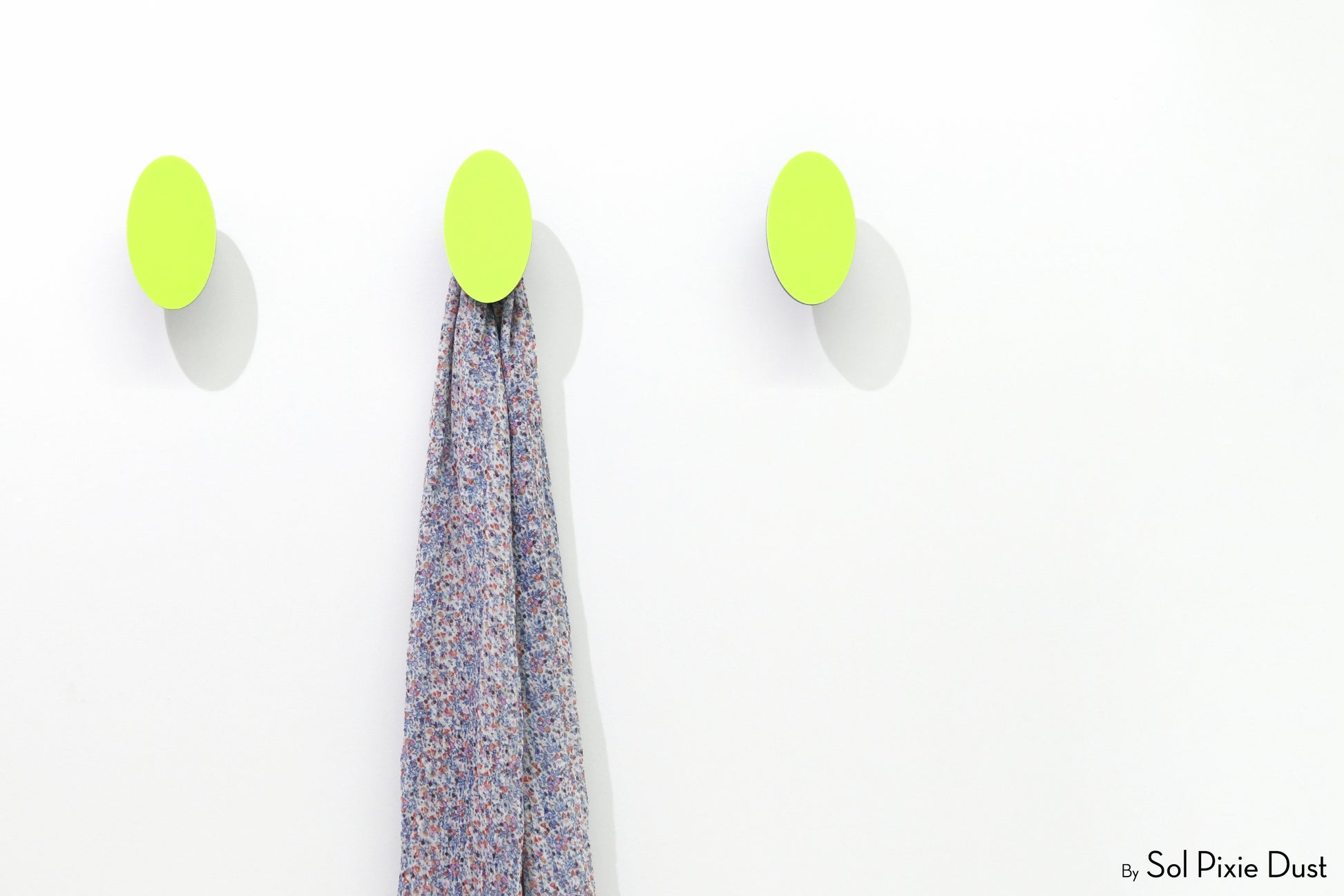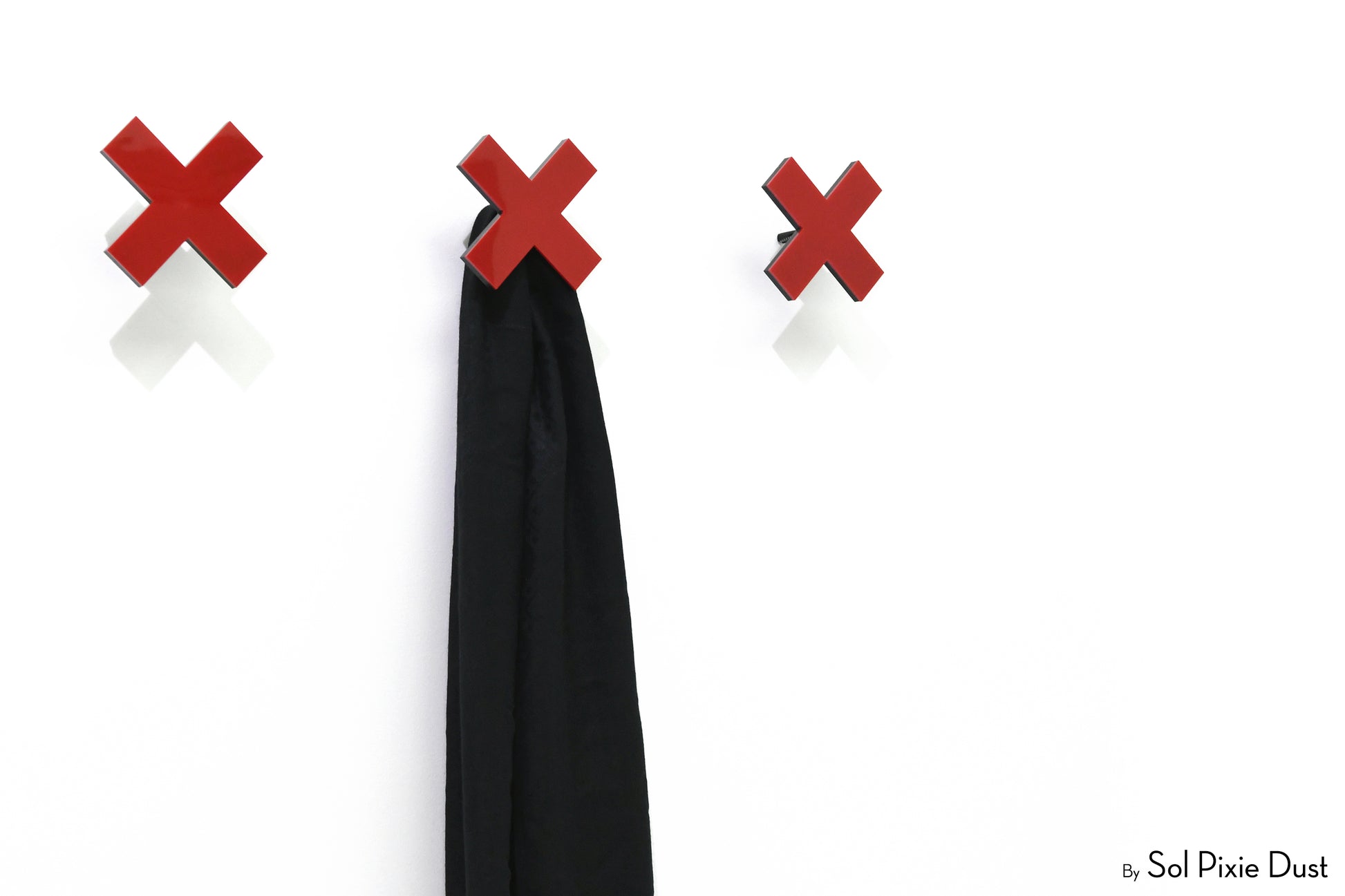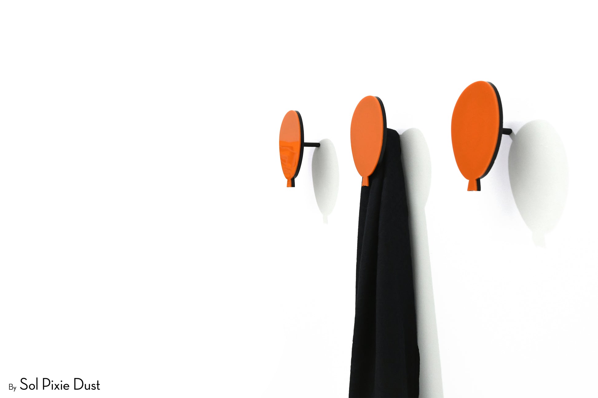 The pegs are designed to project from the wall to securely hold coats, scarves, bags, and accessories. Construction consists of a coloured front acrylic layer bonded to a thicker black acrylic backing, providing durability and contrast. Wall mounting is achieved using a concealed metal screw system with expansion anchors, creating a clean, floating appearance once installed.