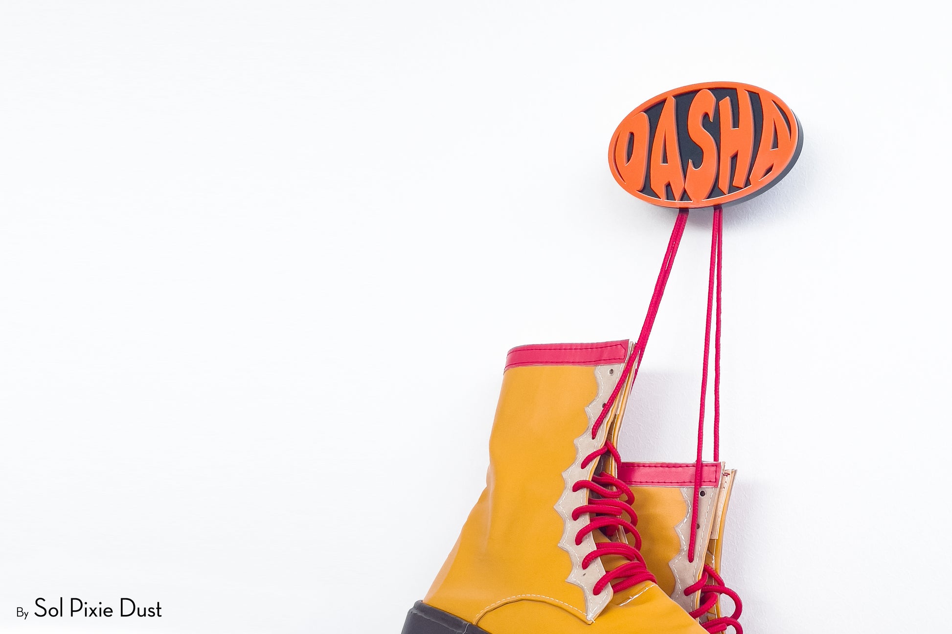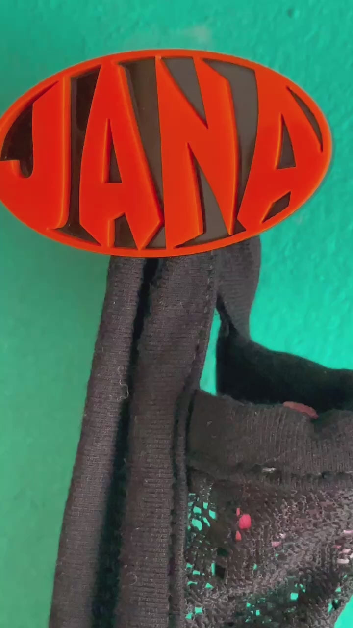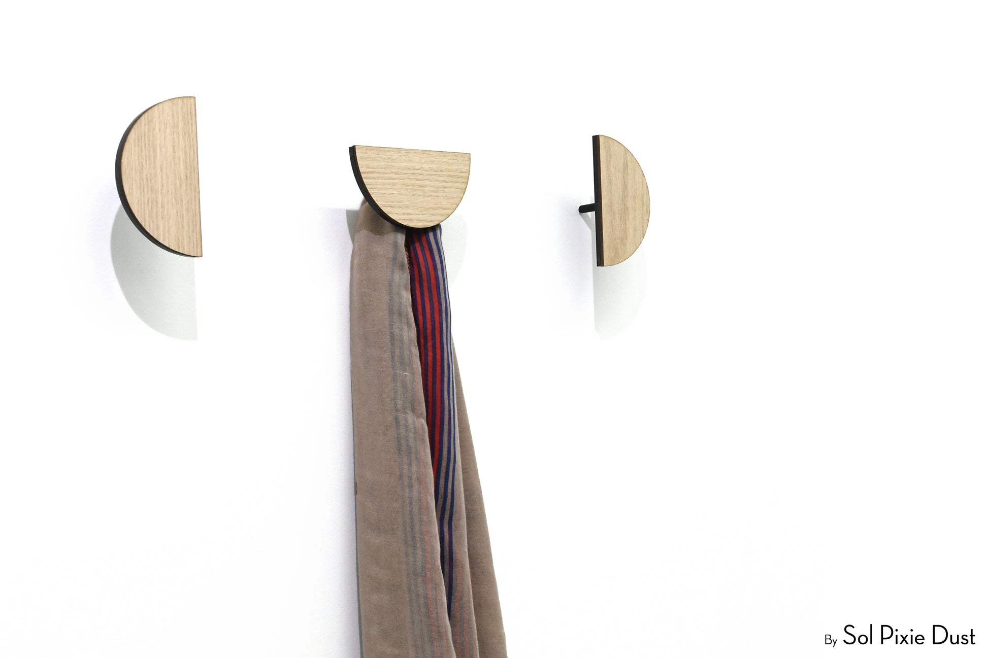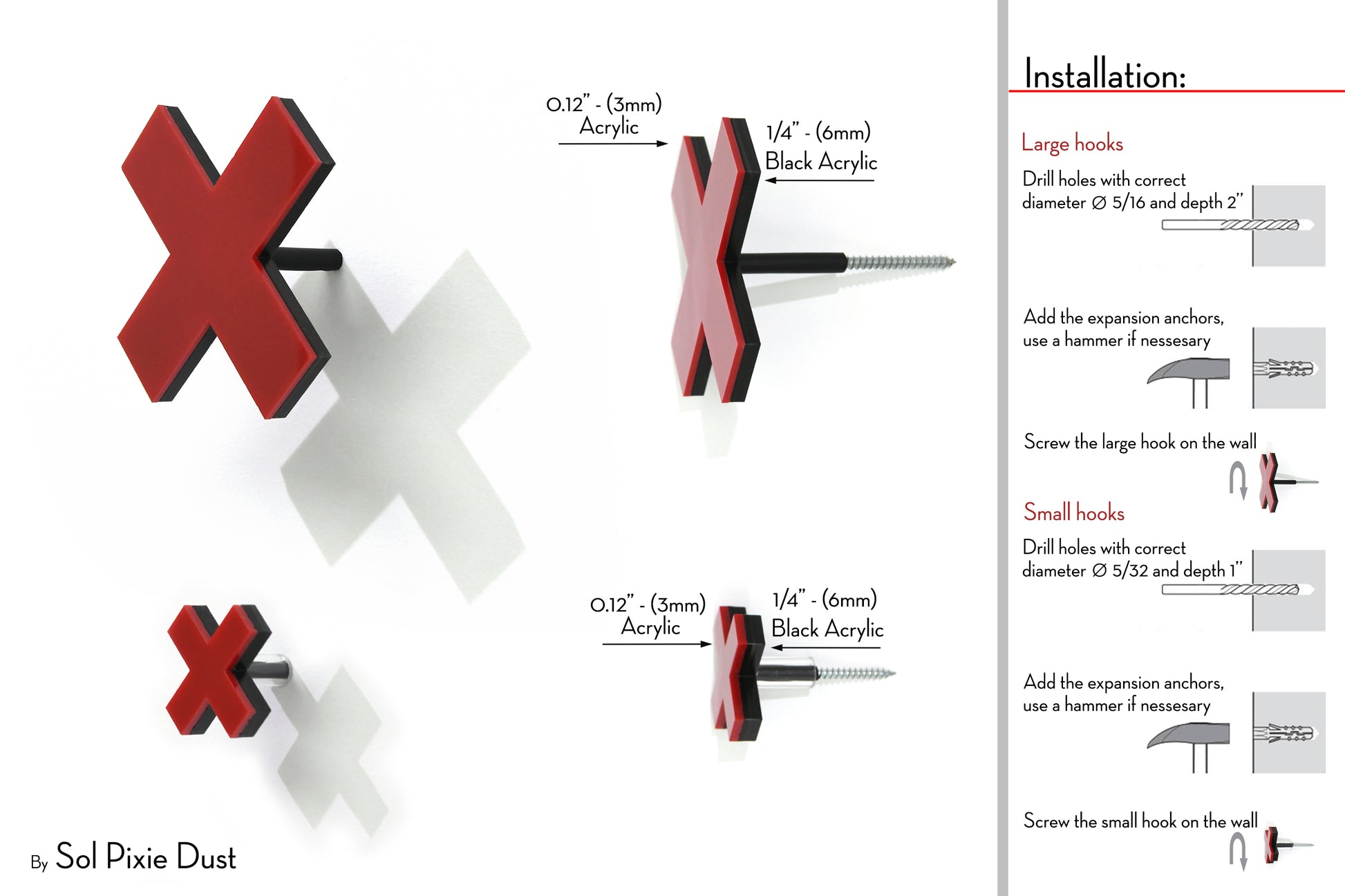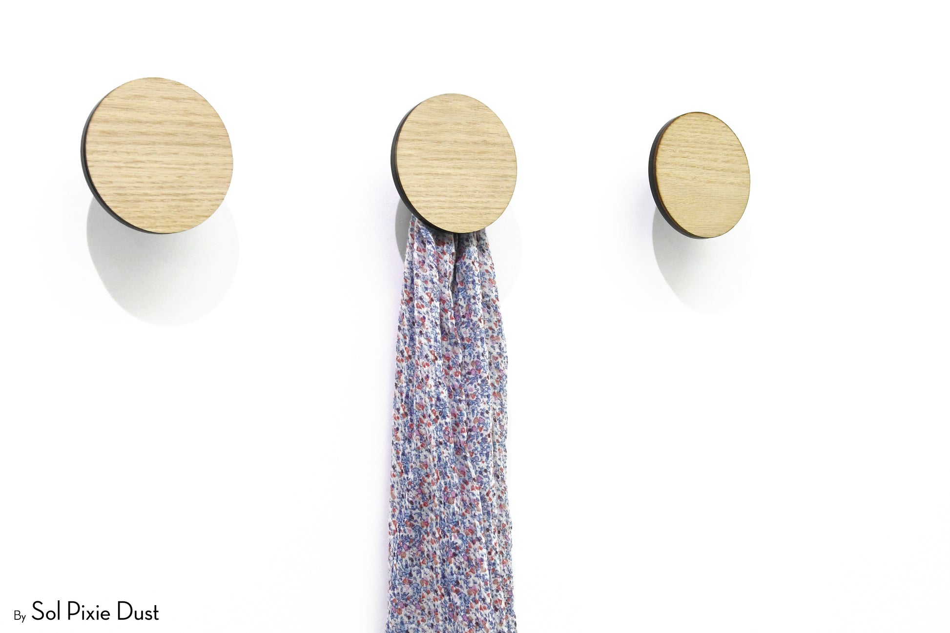 The pegs are designed to project from the wall to securely hold coats, scarves, bags, and accessories. Construction consists of a coloured front acrylic layer bonded to a thicker black acrylic backing, providing durability and contrast. Wall mounting is achieved using a concealed metal screw system with expansion anchors, creating a clean, floating appearance once installed.